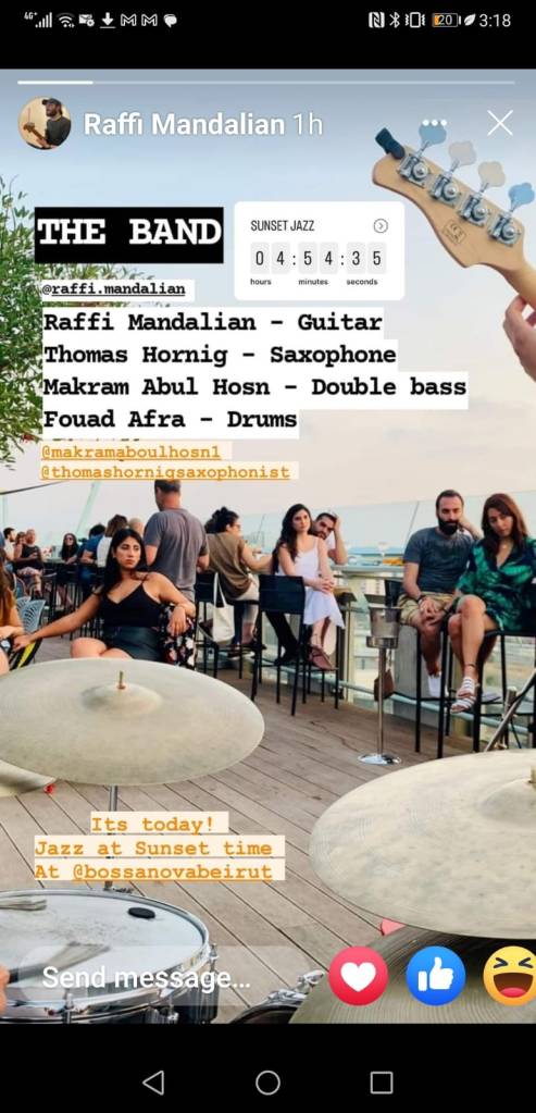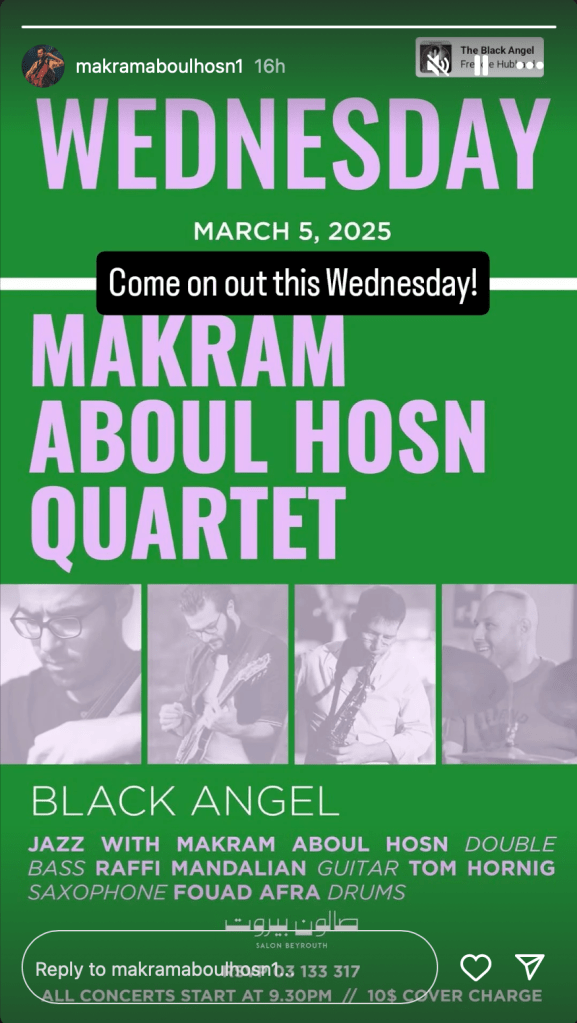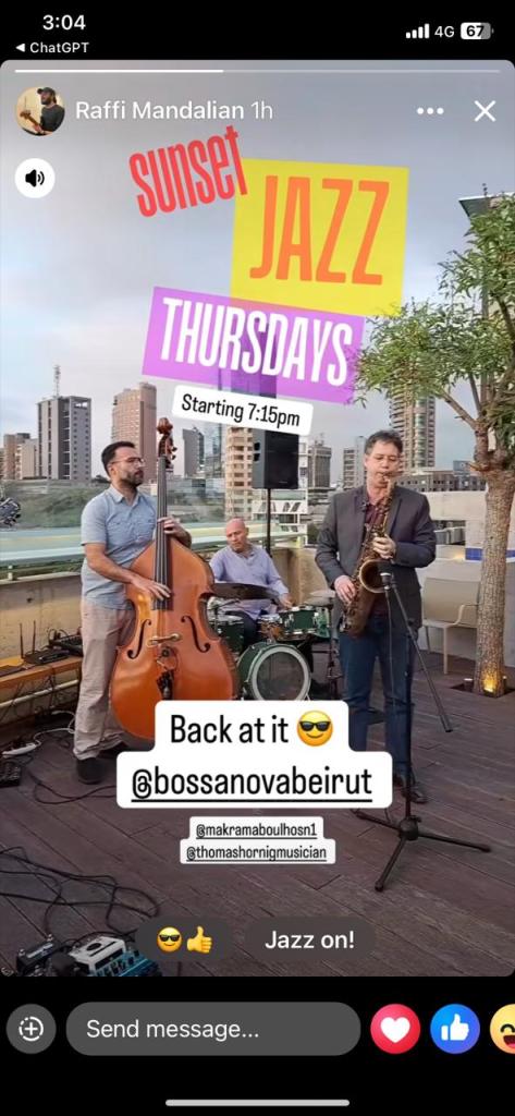 This performance features Tom Hornig on saxophone, Jack Gregg on acoustic bass, and Ghazi Abdelbaki on drums, with Ziad Rahbani playing his celebrated piece, ‘Houdou Nisbi.’ It’s one of the few times Ziad performed live in such an intimate setting, where a saxophonist was prominently featured. The musicians still remember it as a unique experience, reflecting Ziad’s deep connection to Lebanese culture and the widespread admiration for his work as a composer, playwright, and social commentator. https://fb.watch/uoVVuBXzv8/