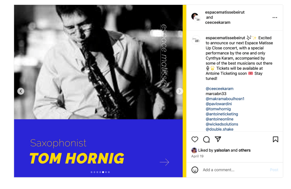 “Les Grelot” Walid Tawil Qtet, Dhour Chweir 2024“Nizar” by Bruno Paoli (Piano) featuring Scarlet Munzer (Voice), Arnaud Oeggerli (Drums) Reudi Felder (Double Bass) and Thomas Hornig (Saxophone). Recorded at “NOW” Beirut in July, 2018