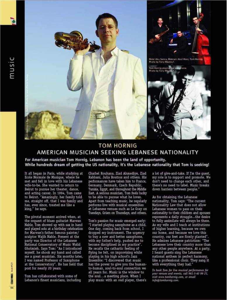 Tom Hornig settled in Beirut in 1994, and has toured all over the world with many of Lebanon’s most celebrated artists but also American and French Musicians including Julia Boutros, Omayma Khalil, Ousama Rahbani, Arthur Satyan, The D & G Band, Thierry Paul, Michel Bontemps, Yochko Seffer, Manu Fraiman to name a few. Tom is American and French educated and currently holds the position of professor at the Lebanese Conservatory in Beirut. Recently awarded the Artist’s Golden Visa in Dubai, he opted to take a sabbatical year teaching Middle School and High School Band at the American Community School, Beirut last year but has since returned to his tenured post and heads the Jazz Department at the LHNCM now in his 30thyear. Tom also holds the coveted “Selmer Artist” distinction (since 2015).
