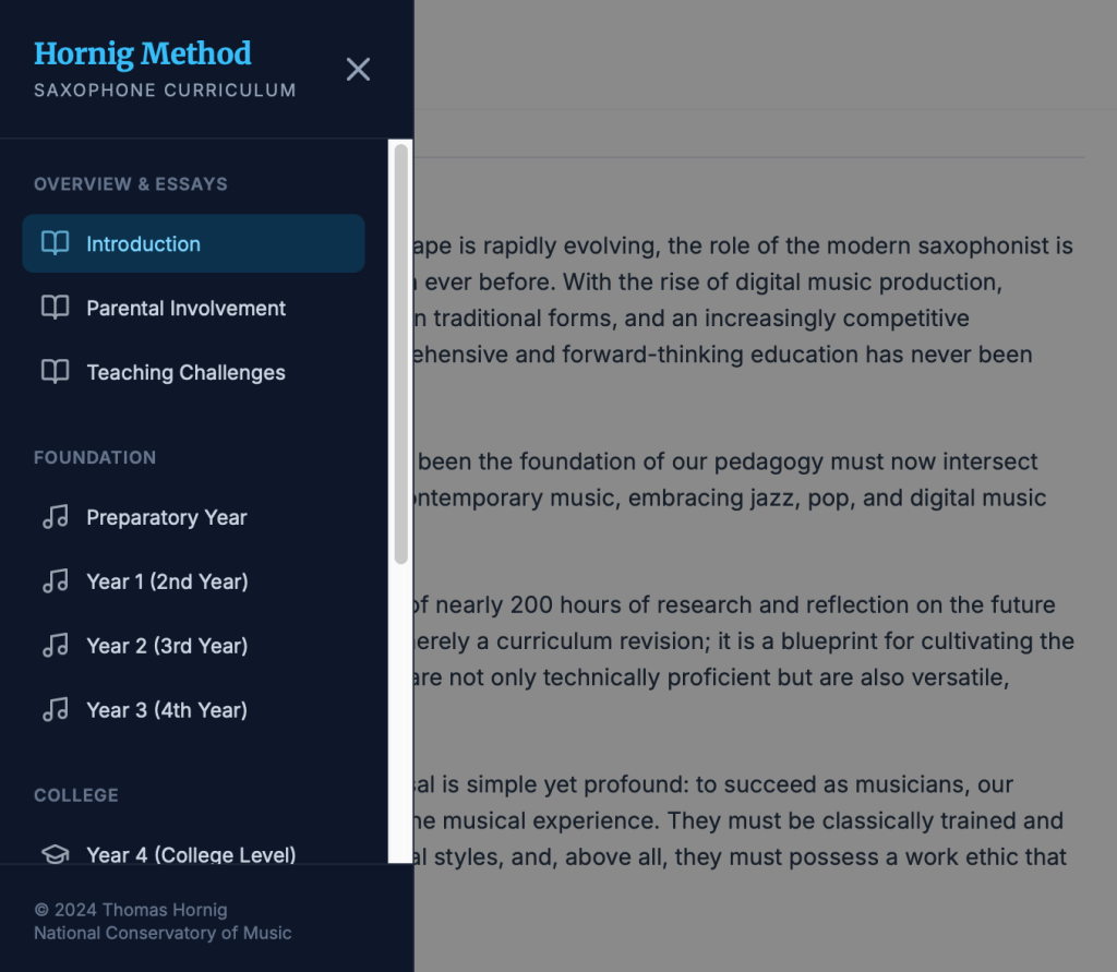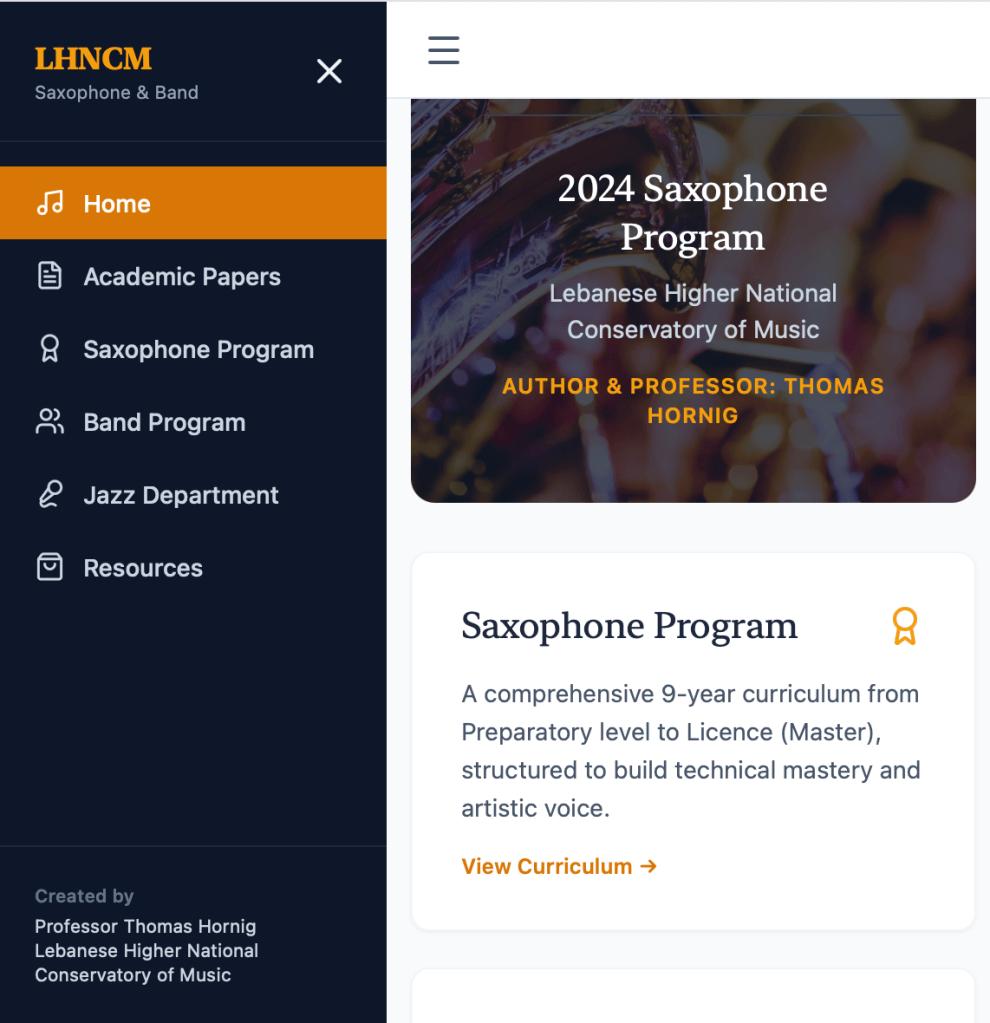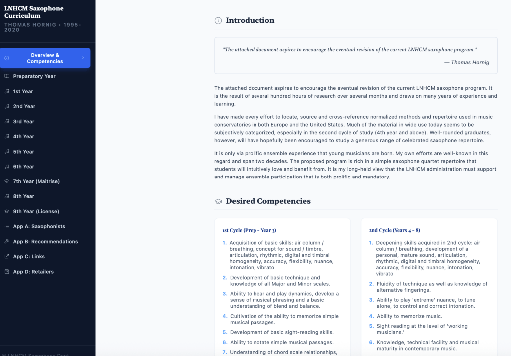 Hornig Method – Saxophone Curriculum (Preview) Interactive preview of my full conservatory-to-career saxophone curriculum. Click the image or the button below to open the interactive curriculum preview in a new tab. Open Interactive Saxophone Curriculum Preview LHNCM Saxophone and Band Curriculum Version 2 Version 2 Link Link to Interactive Website Link to Interactive Website Link to Interactive Website Link to Interactive Website Link to Interactive Website Link to Interactive Website Link to Interactive Website Link to Interactive Website